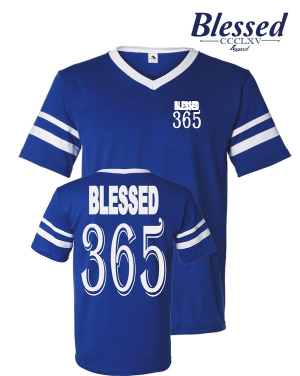 The Blessed 365 Striped Sleeve V-Neck is made from a 50% polyester/50% cotton jersey knit and features a contrast color 1x1 rib knit v-neck collar, two contrast color sleeve stripes, set-in sleeves, double-needle hemmed sleeves and bottom.